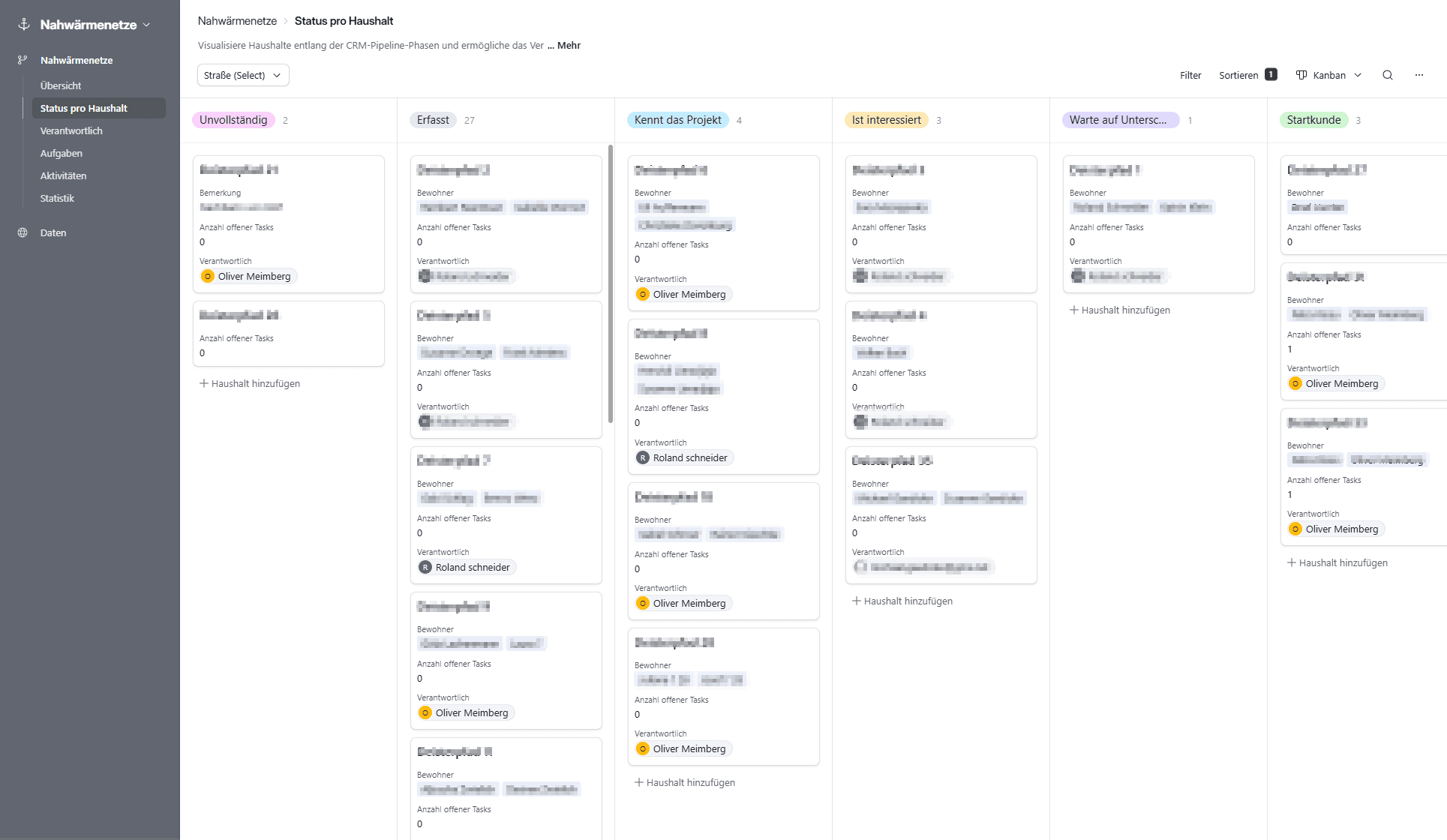 Was als einfache Liste begann, wurde schnell strukturierter. Haushalte, Straßen, Bewohner, Vermieter. Dazu Aufgaben, Gespräche, Rückmeldungen. Klassisches CRM – nur eben nicht für Sales, sondern für Nachbarschaft.
